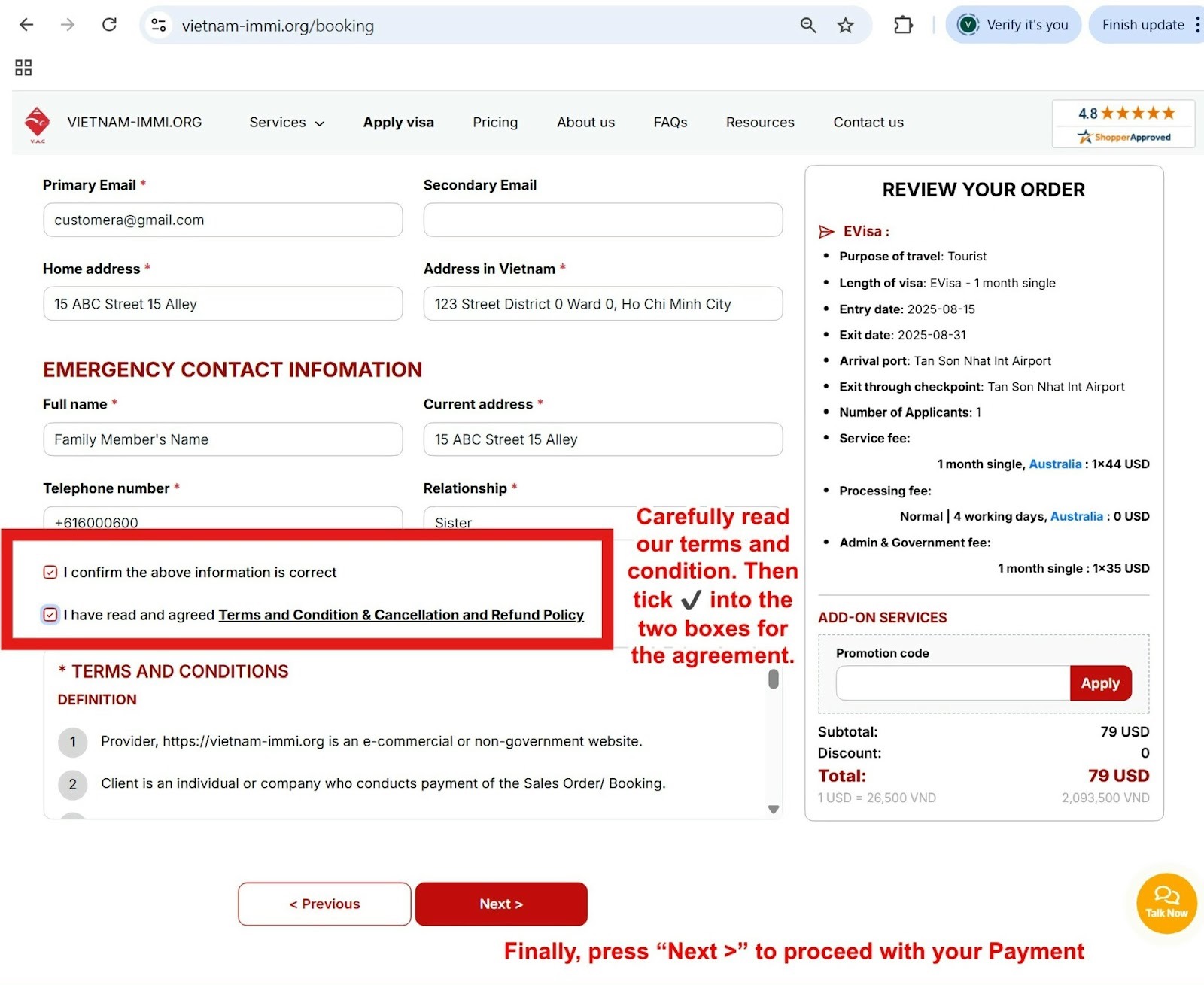 Reviewing and accepting our Terms and Conditions, which include important guidelines like cancellations, refunds, privacy, and service disclaimers, is necessary before submitting your visa application.