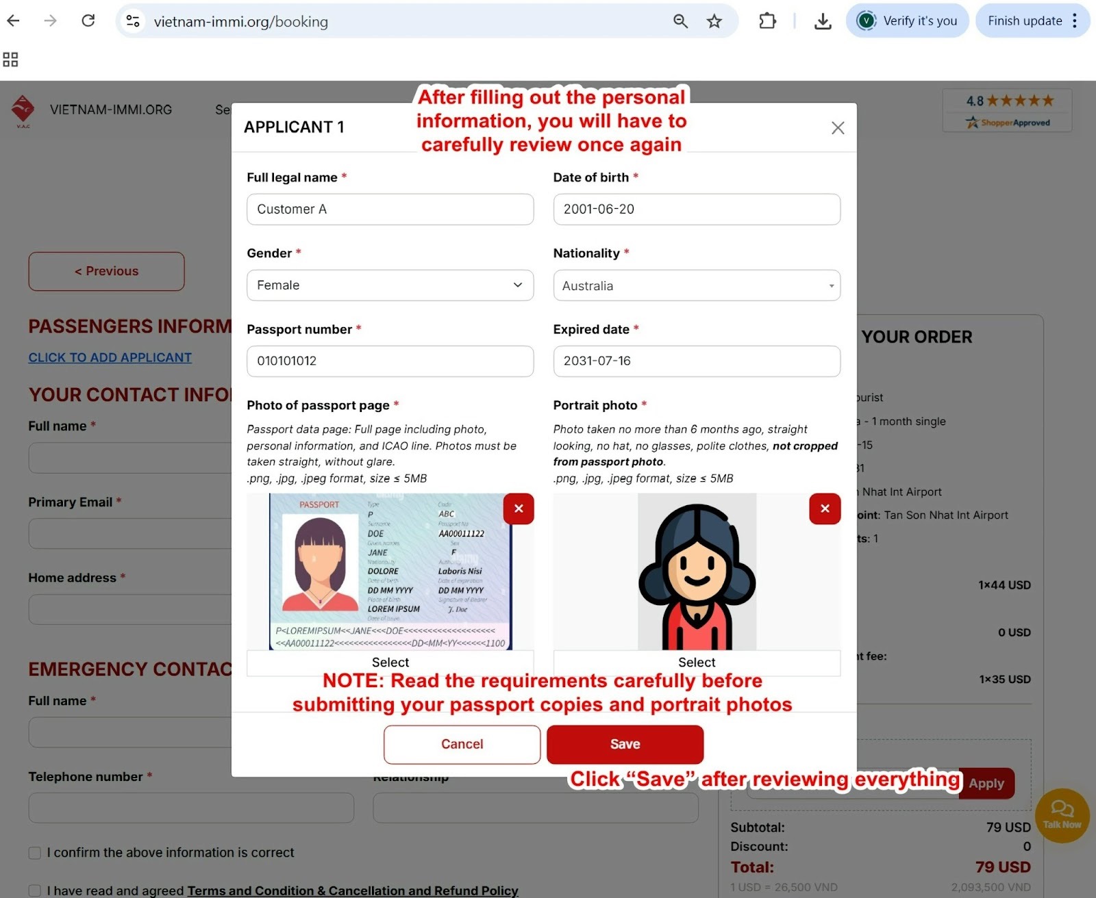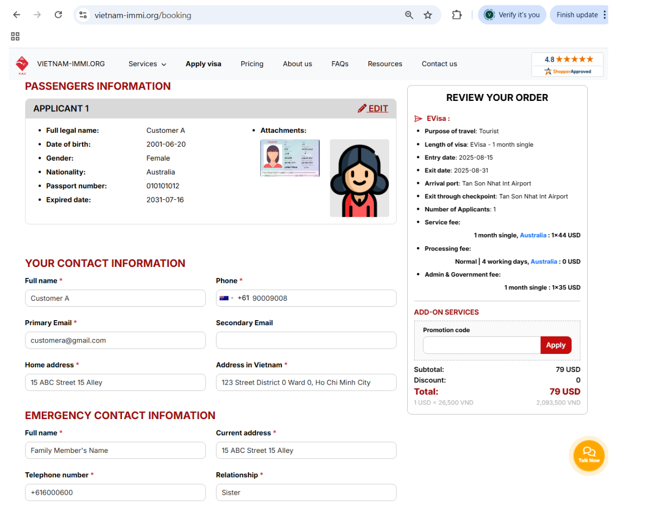 Once all your personal information is completed, review your application on the right-hand panel. To ensure that your application is able to be processed without any issues and we can update you promptly, it is essential that we have your contact information and emergency contact (e.g., family, friends, or relatives, etc.).