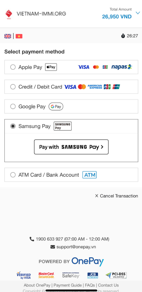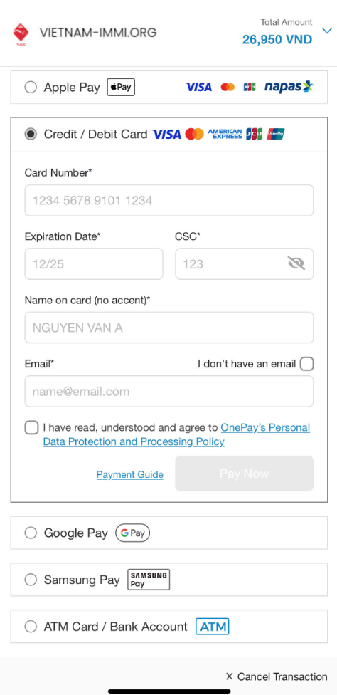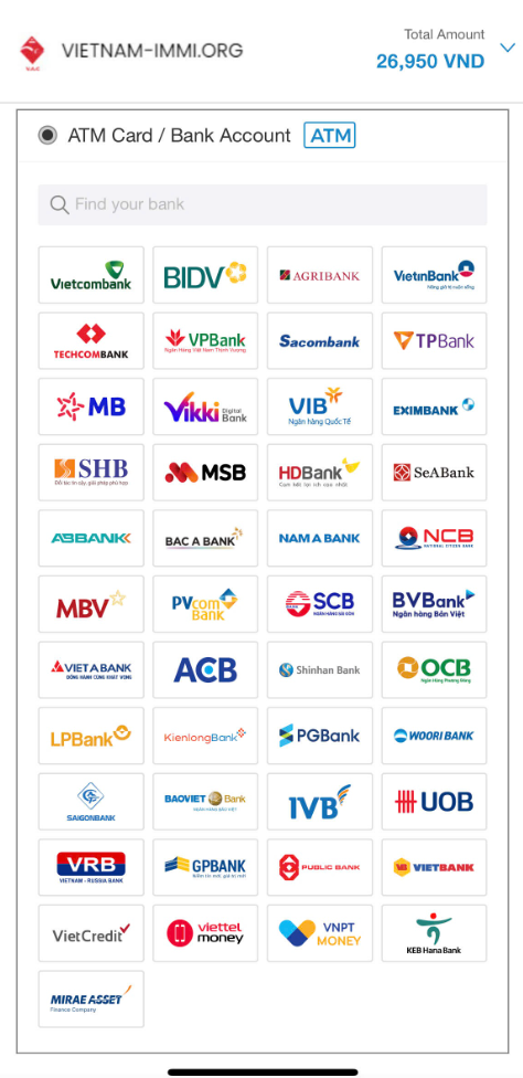 OnePay is the main payment gateway used in the Vietnam Immi app. It supports multiple modern and traditional payment options, including: