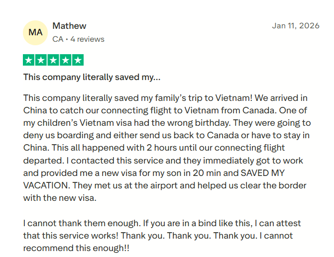 One of the most powerful real reviews Vietnam visa service comes from Mr. Mathew on Trustpilot, who shared a real emergency situation: